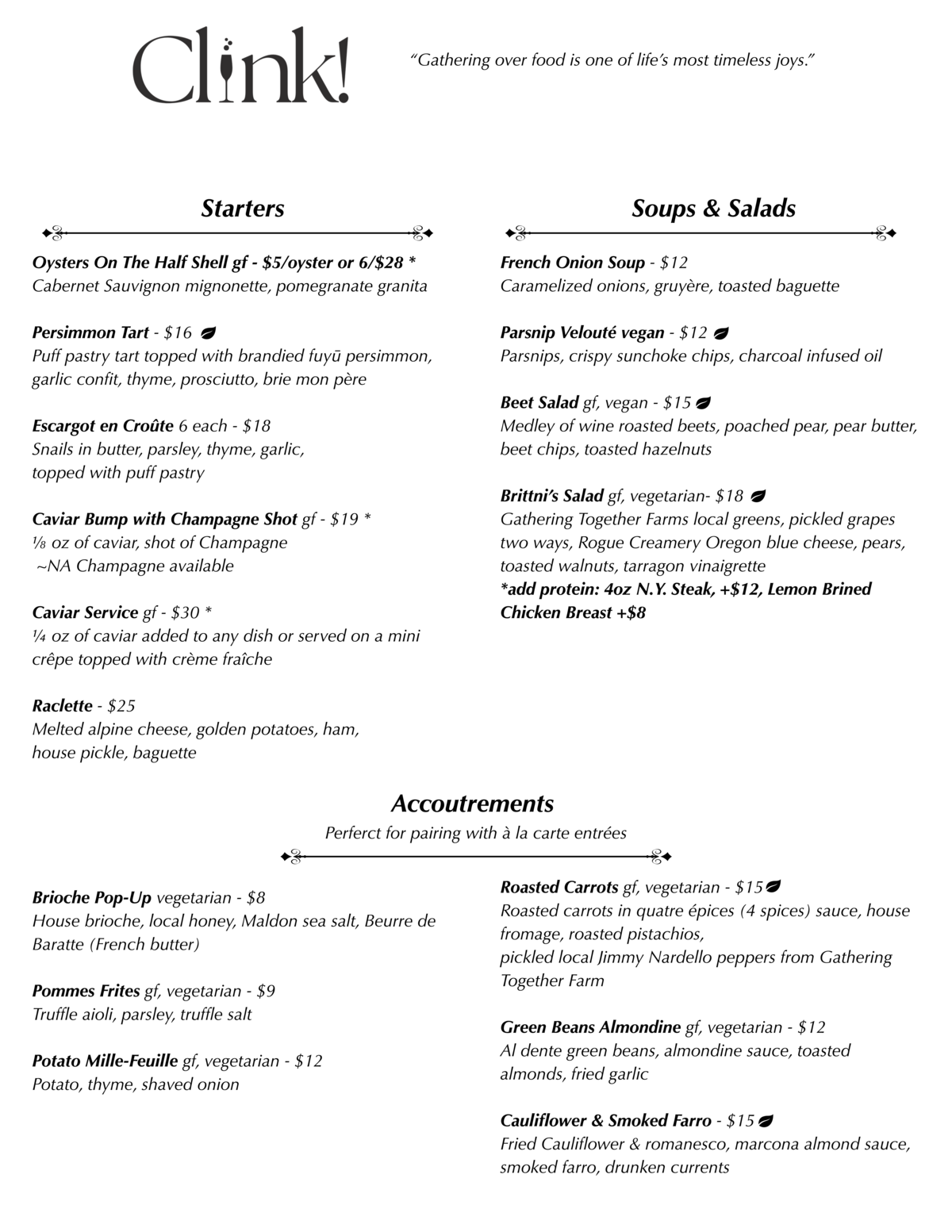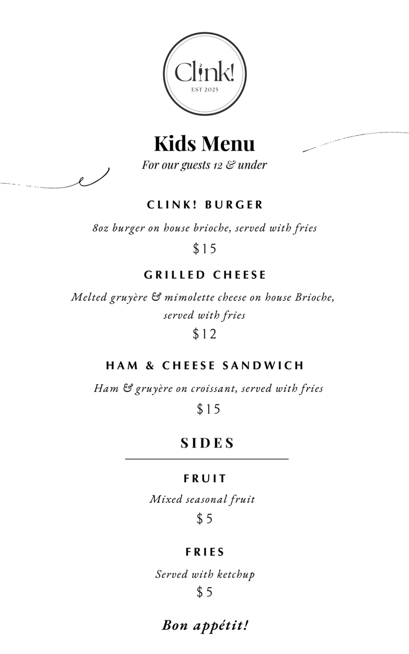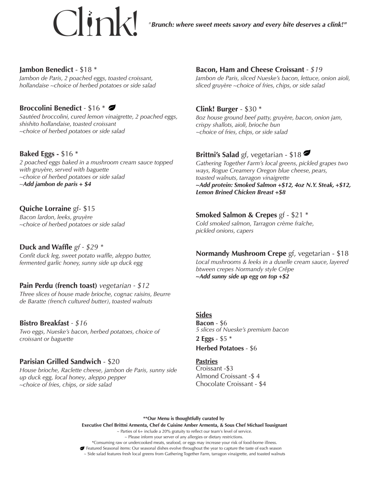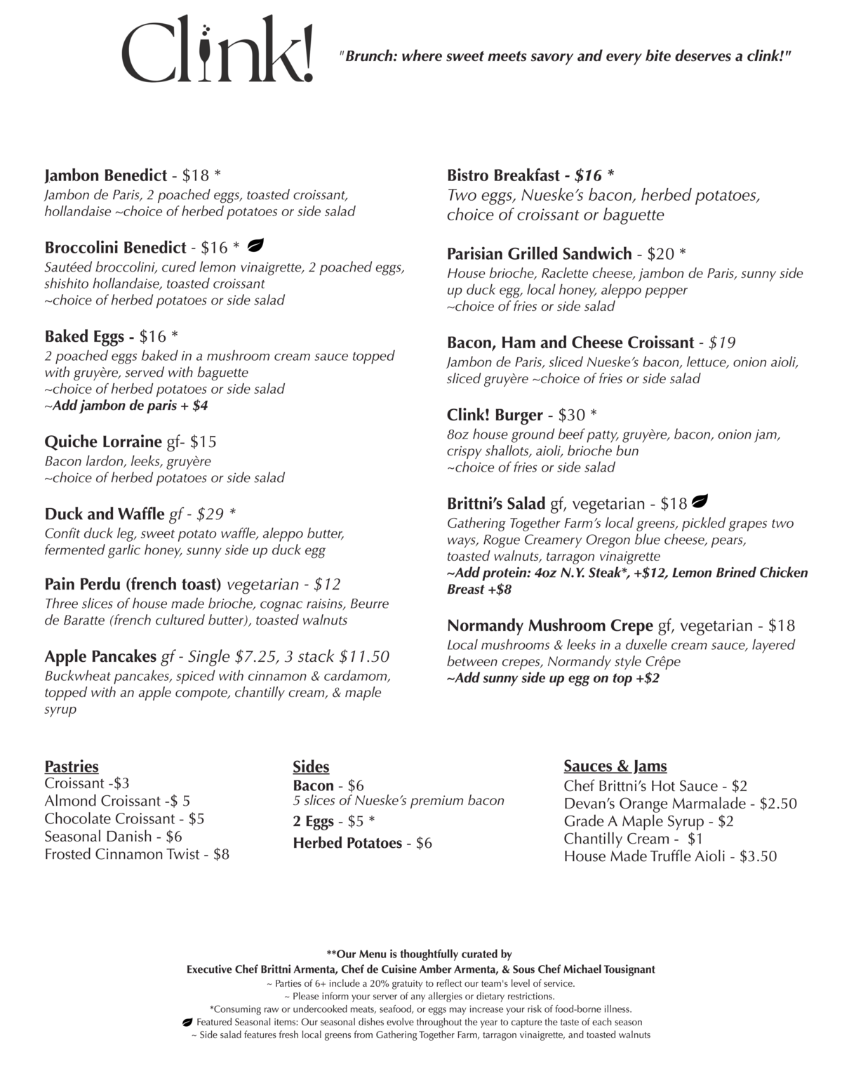 At Clink!, our French-American menu is a celebration of fresh, seasonal ingredients thoughtfully crafted to highlight the best of both cuisines. Curated with care by Executive Chef Brittni Armenta, Chef de Cuisine Amber Armenta, and Sous Chef Michael Tousignant, each dish reflects creativity, balance, and a deep respect for flavor.