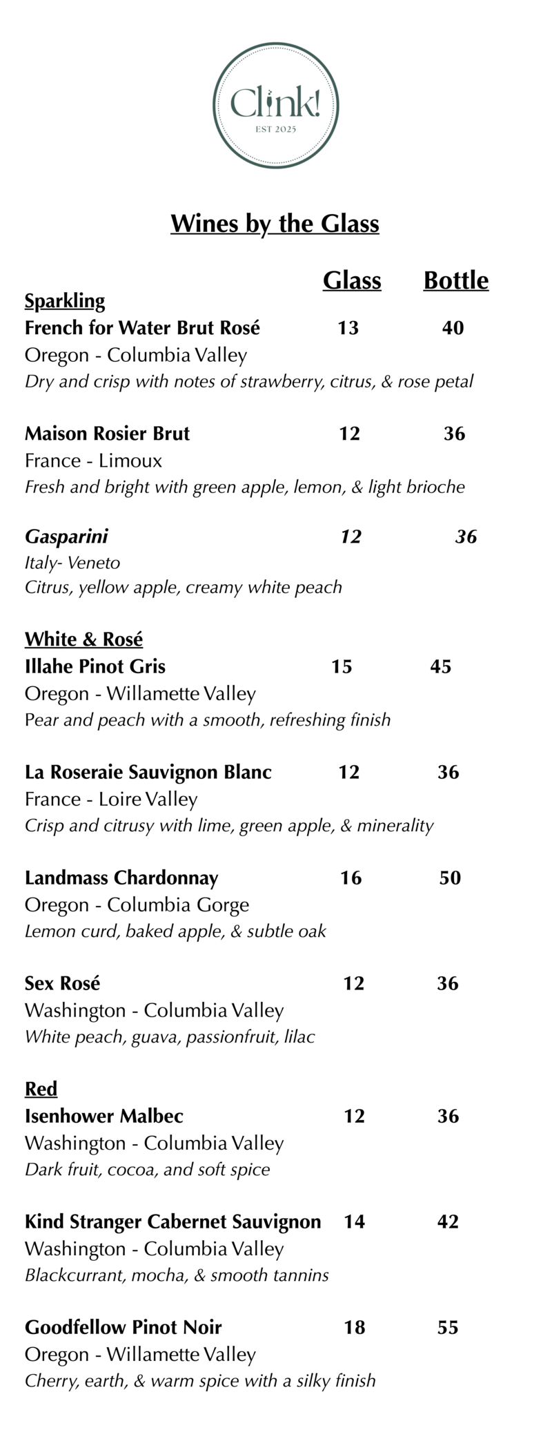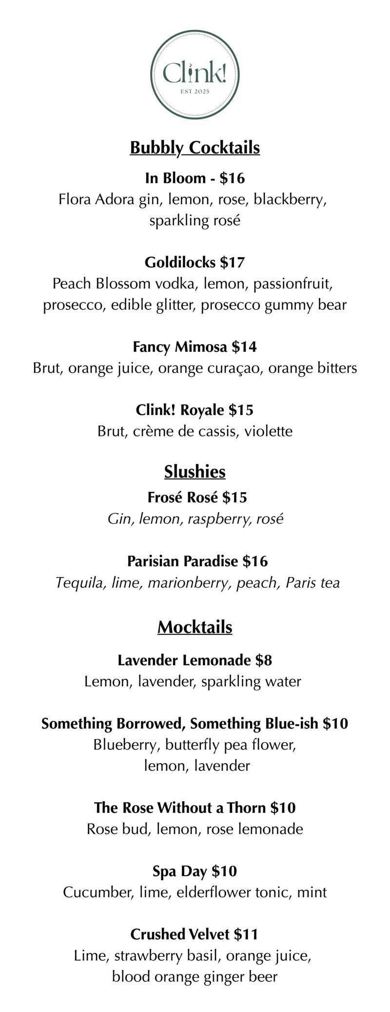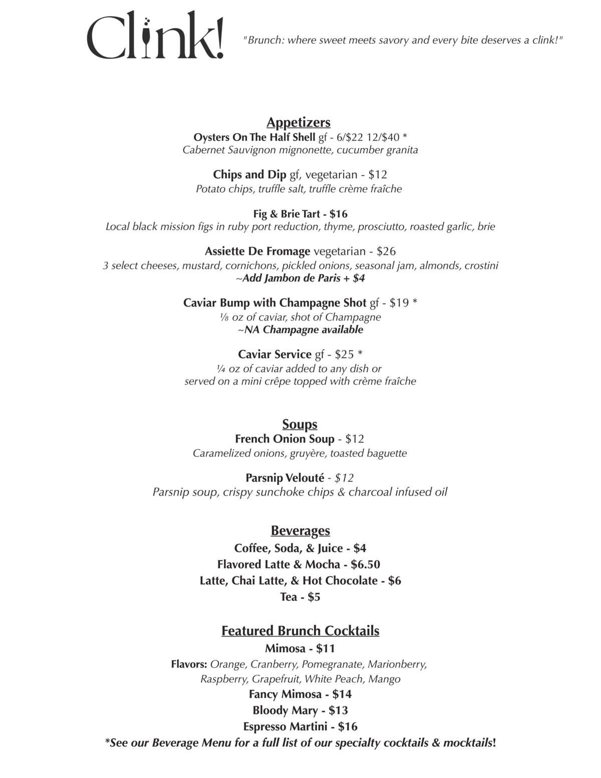 At Clink!, our French-American menu is a celebration of fresh, seasonal ingredients thoughtfully crafted to highlight the best of both cuisines. Curated with care by Executive Chef Brittni Armenta, Chef de Cuisine Amber Armenta, and Sous Chef Michael Tousignant, each dish reflects creativity, balance, and a deep respect for flavor.