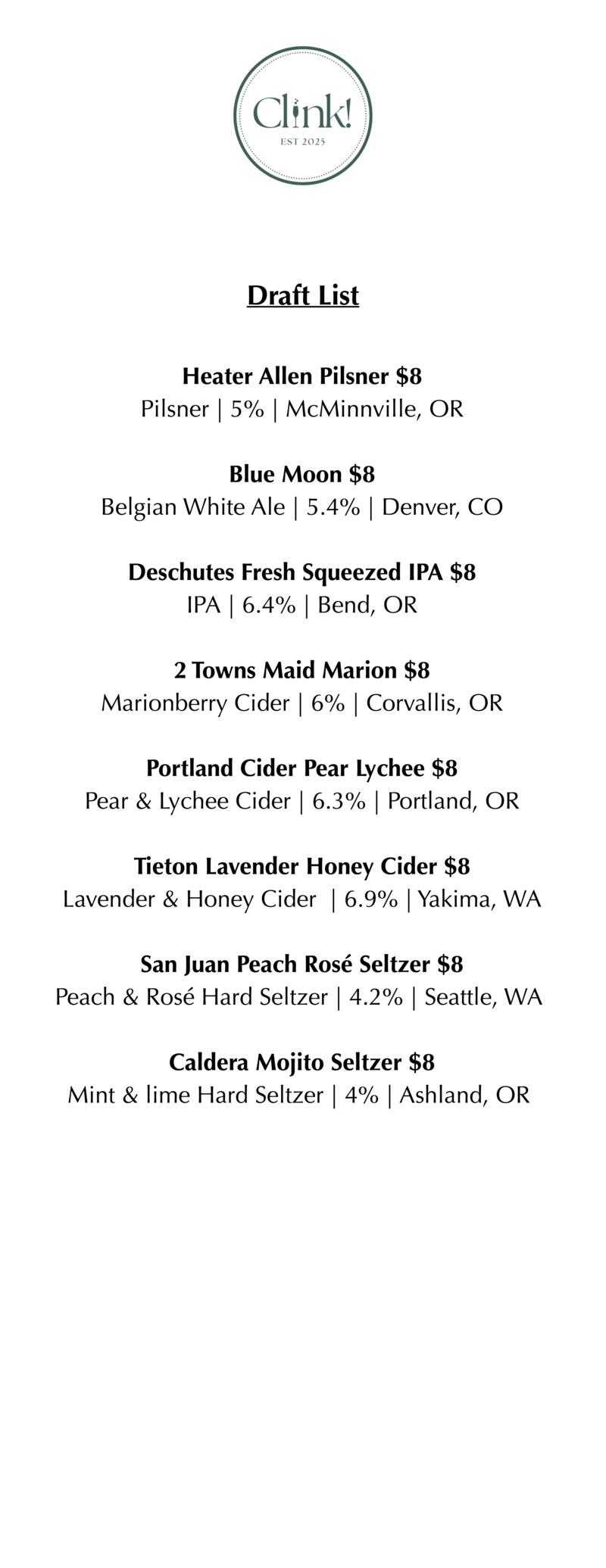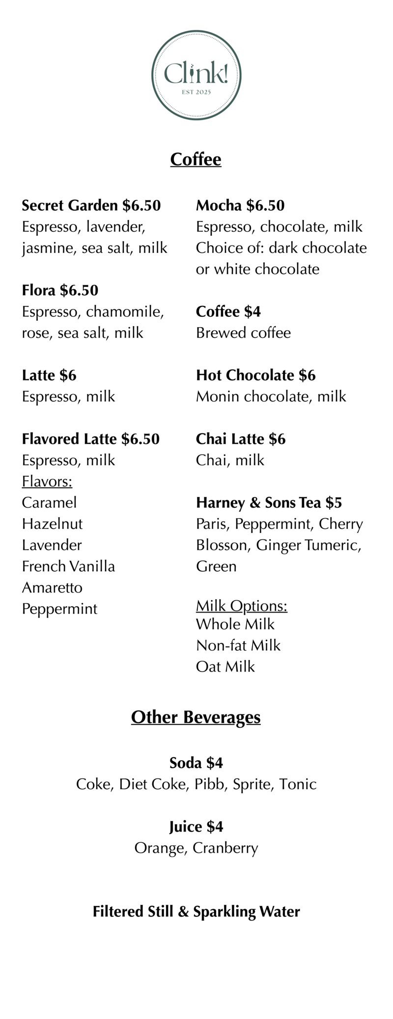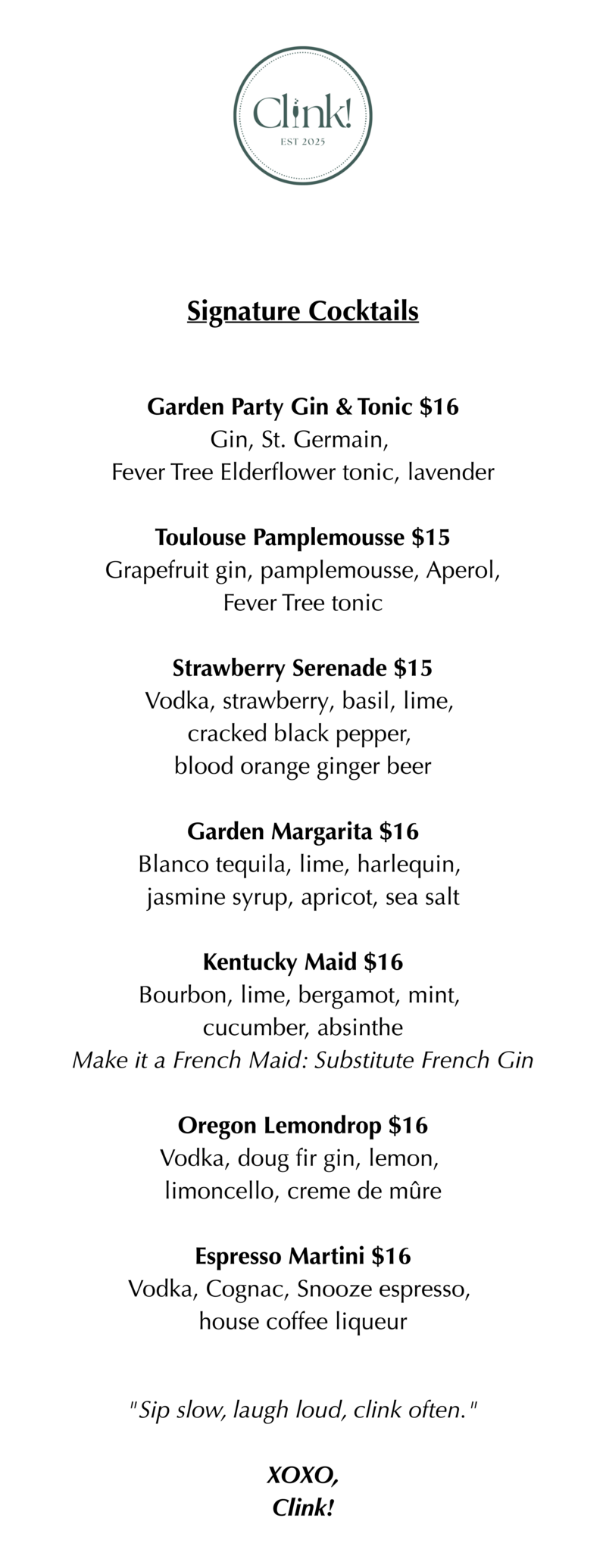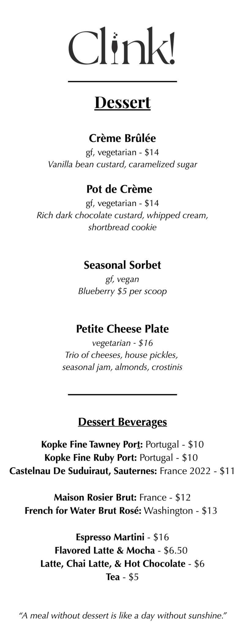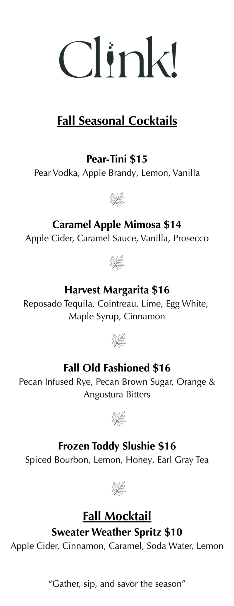 We invite you to join us and experience the delicious, ever-evolving flavors of Clink!. Please view our seasonal menus below.
